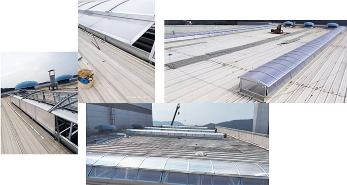 2. 圓拱型電動采光排煙天窗主要材料通常采光不同規(guī)格的鋁型材,采光材料一般使用PC陽光板或FRP采光板,天窗頂部為拱型,其好處是可以折射陽光擴大室內(nèi)采光面積,且拱型的窗面利于夏季排雨,冬季又不易積雪,本身的自潔性較好,表面浮塵雨水沖刷,經(jīng)常保持較好的采光效果。