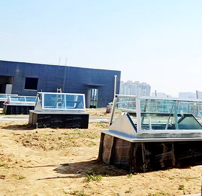 天窗外觀為三角形,天窗頂部可采用采光板或玻璃,有效增加室內(nèi)采光,且防水性好。開啟電機(jī)設(shè)計(jì)成24V安全電壓,可連接消防聯(lián)動控制系統(tǒng)及風(fēng)、雨、煙感應(yīng)器。***開啟角度為60°。