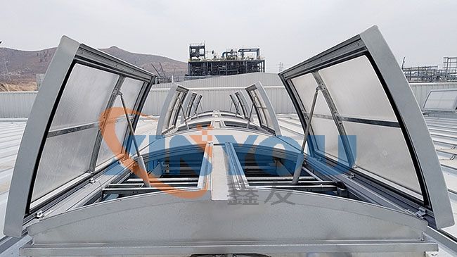 鑫友承接萬(wàn)華化學(xué)集團(tuán)物資有限公司煙臺(tái)綜合倉(cāng)庫(kù)電動(dòng)排煙天窗工程,采用圓拱型對(duì)開(kāi)式采光排煙天窗,該工程全部安裝完畢,已經(jīng)達(dá)到消防工程驗(yàn)收標(biāo)準(zhǔn)。