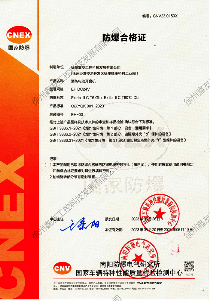 電動(dòng)鏈?zhǔn)介_窗機(jī)防爆合格證書