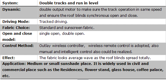 應(yīng)用場(chǎng)所:彎曲、傾斜或水平的中小型遮陽(yáng)場(chǎng)所,如酒店、咖啡廳等玻璃頂。